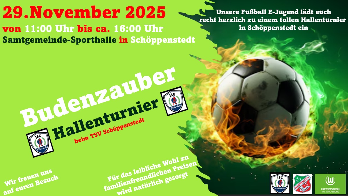 Unsere Fußball E-Jugend lädt euch recht herzlich zum "Budenzauber" in der Samtgemeinde-Sporthalle in Schöppenstedt am 29.11.2025 ab 11 Uhr ein.
