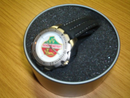 TSV-Schirmmit dreifarbigem TSV-Logo auf einem Segment, Farbe grün-weiss Der Schirm ist 84 cm groß als Stockschirm mit beige Holzgriff und automatisch zu öffnen. Preis: 9,50 Euro |