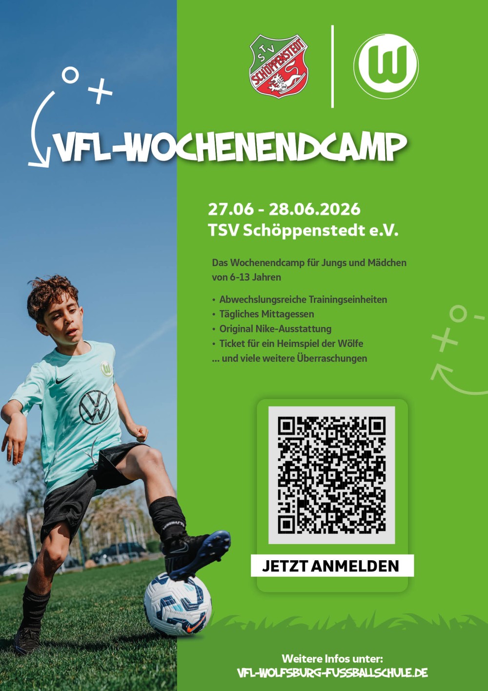 Zum zweiten Mal kommt der Bundesligist VfL Wolfsburg am 27. und 28.06.2026 auf die Sportanlage in Schöppenstedt. Erlebe spannende und ereignisreiche Fußballtage mit dem VfL Wolfsburg! Es erwarten dich abwechselungsreiche Trainingseinheiten, Spiele und Übungsformen, die sich am Spielintelligenzansatz orientieren. Am Abschlusstag findet ein großes Fußballfestival mit Speed-Kick, Fußball Billard, Siegerehrung und vielen anderen Highlights statt. Die Teilnehmerzahl ist begrenzt. Seid dabei und habt an zwei Tagen wundervollen, unvergesslichen Fußballspaß. Anmeldungen unter www.VfL-Wolfsburg-Fußballschule.de oder über den QR-Code auf dem Flyer. | Bilder zum Bericht klicken zum Vergrößern |