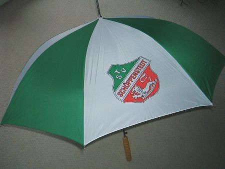 TSV-Schirmmit dreifarbigem TSV-Logo auf einem Segment, Farbe grün-weiss Der Schirm ist 84 cm groß als Stockschirm mit beige Holzgriff und automatisch zu öffnen. Preis: 9,50 Euro |